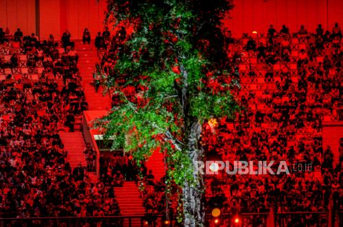Warga menyaksikan Upacara Pembukaan PON Papua di stadion Lukas Enembe, Kompleks Olahraga Kampung Harapan, Distrik Sentani Timur, Kabupaten Jayapura Papua, Sabtu (2/10). Presiden Republik Indonesia Joko Widodo resmi membuka gelaran PON Papua yang berlangsung hingga 15 Oktober 2021 mendatang. PON Papua mempertandingkan 56 cabang olahraga dengan diikuti sebanyak 6.442 atlet. Republika/Thoudy Badai